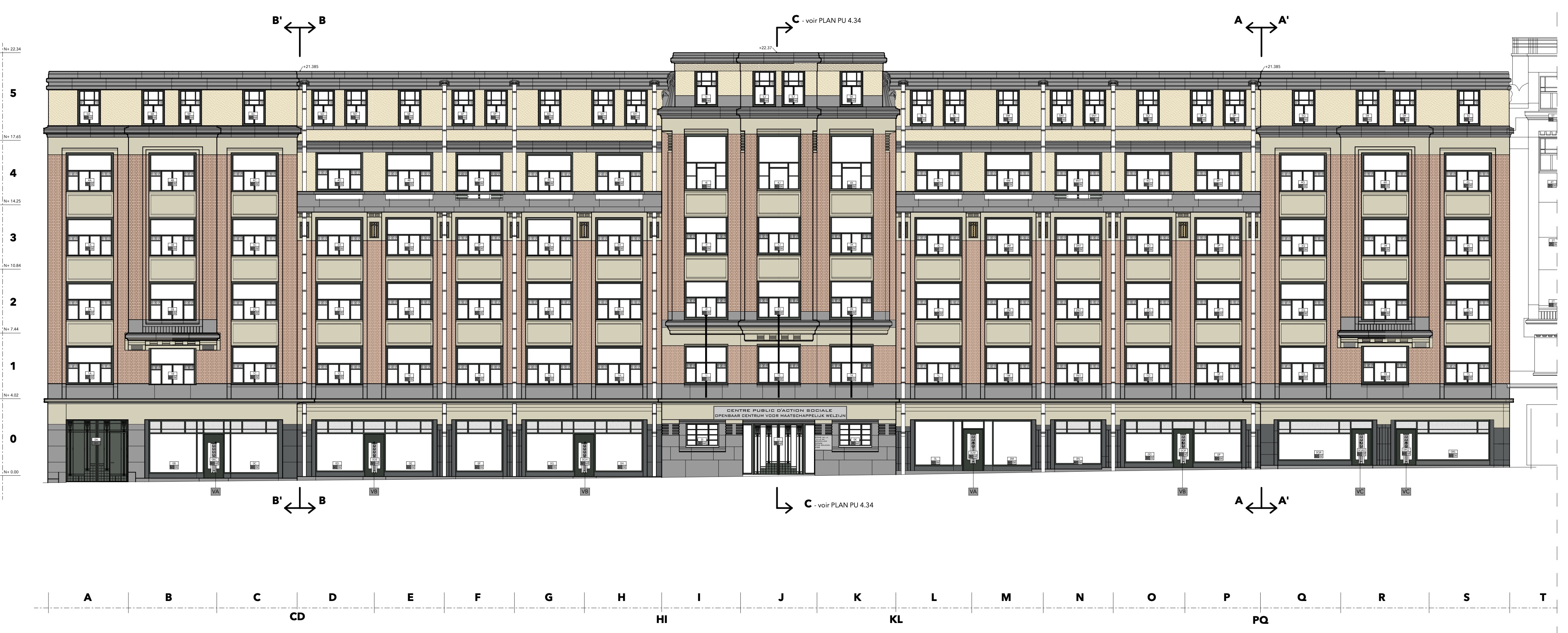 Le projet inclu également la récalification de la cour arrière, en favorisant l’usage de la mobilité douce, en créant des espaces couverts pour le parcage vélos du personnel et des visiteurs. La restauration de toutes les façades ainsi que la reconstitution de la grande verrière de la cage d'escalier. Enfin, le auvent en béton et les devantures des commerces rue Haute sont également restaurés. La proposition de restauration des devantures combine à la fois le souhait de rétablir une situation historique cohérente et de conserver une configuration en adéquation avec le fonctionnement actuel.