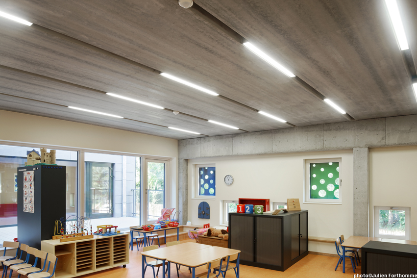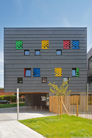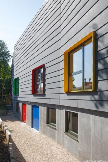 Le retrait par rapport à la voirie, les décrochements et la dynamique des façades participent à l'expression d'un bâtiment public dans un quartier résidentiel. L’aspect ludique des façades fait référence à ses utilisateurs : les maternelles.