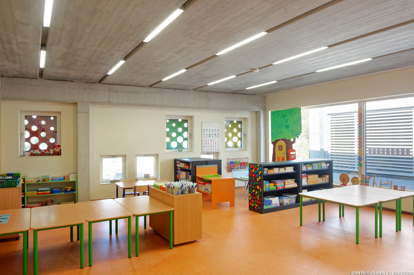 La nouvelle école maternelle se développe sur trois niveaux de plain-pied. Le bâtiment bas s'insère ainsi dans un tissu urbain peu dense. L’intégration du bâtiment dans les gabarits des bâtiments voisins, lui confère une volumétrie particulière et dynamique.
