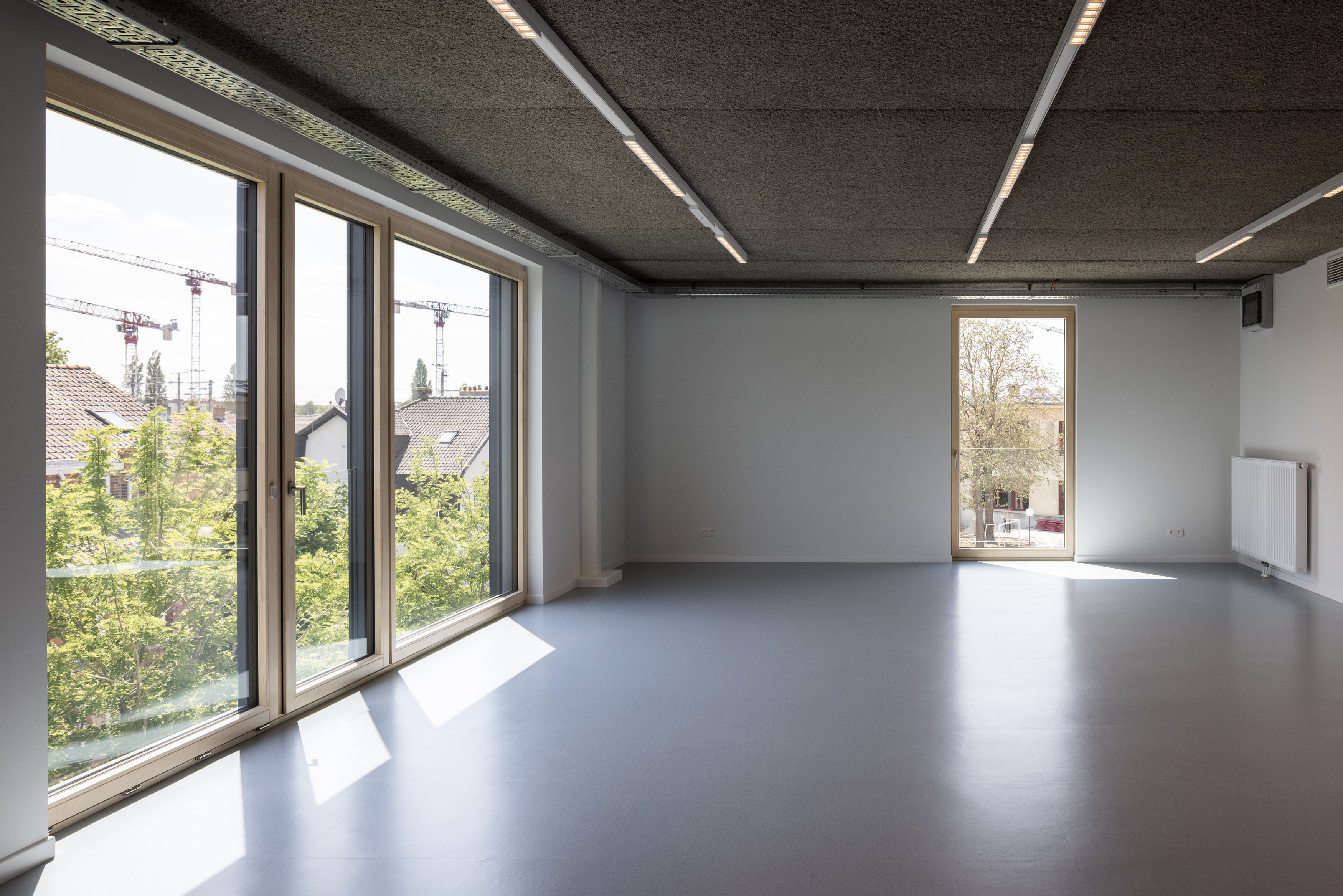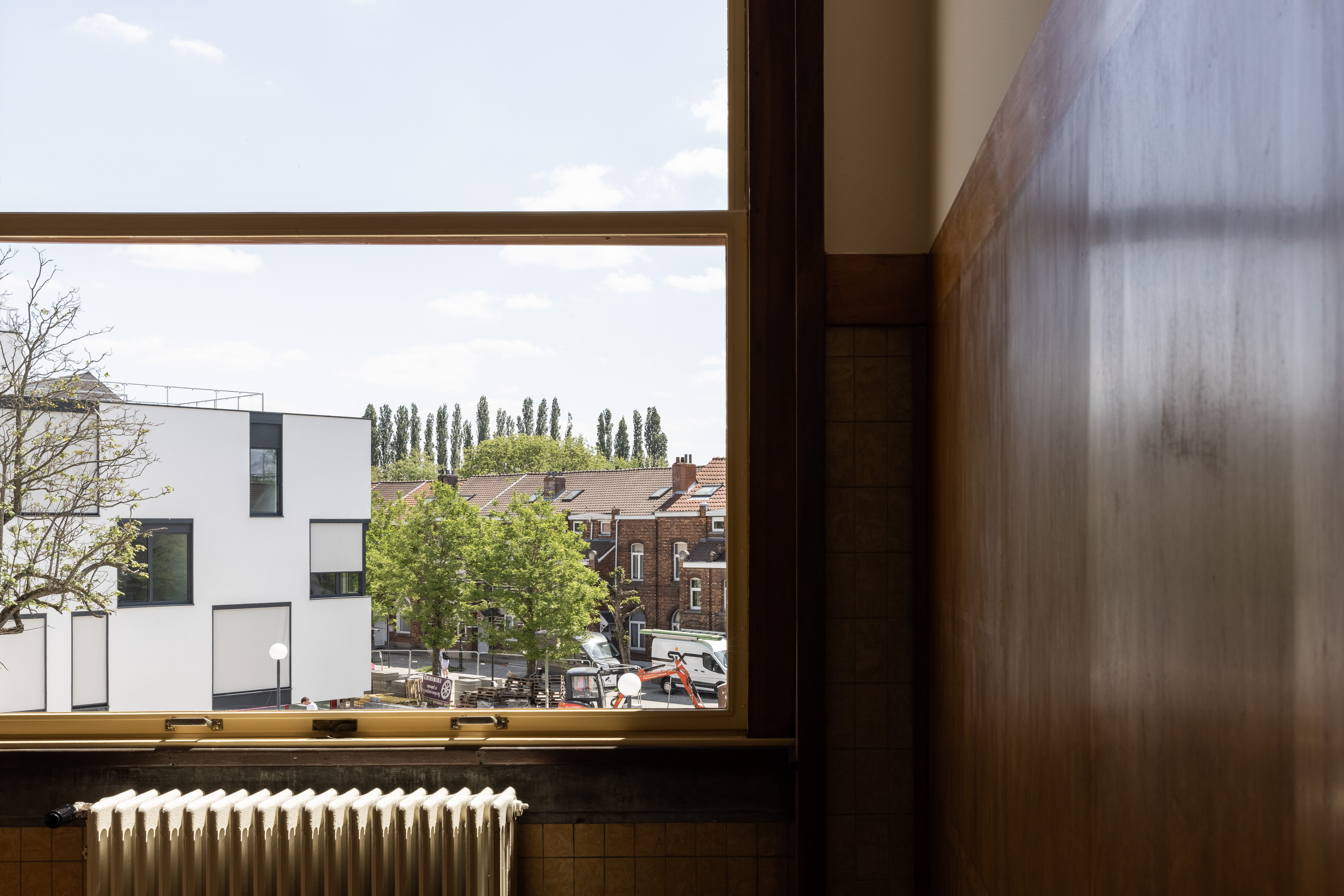 L'école de La Roue a été construite en 1935 sur base des plans de l'architecte communal Henri Charles Wildenblanck. Le nouveau bâtiment qui acceuil les classes maternelles s’intègre en respectant les lignes du contexte urbain et exprime sa fonction de bâtiment public. Les surfaces nécessaires pour les nouveaux locaux sont réparties en deux volumes distincts, en léger décalage l’un par rapport à l’autre. Le décalage renforce le sentiment que le bâtiment qui contient les classes maternelles « flotte » dessus la cour et se distinct des services destinées aux élevés de primaires au sous-sol. Le nouveau bâtiment, haut de quatre niveaux, est très compact. L'occupation au sol est moindre que les éléments démolis, ce qui permet de conserver l'intégralité de la surface de cour. Les façades sont épurées. Les ouvertures sont étudiées pour offrir un maximum de lumière naturelle aux classes tout en limitant les surchauffes.