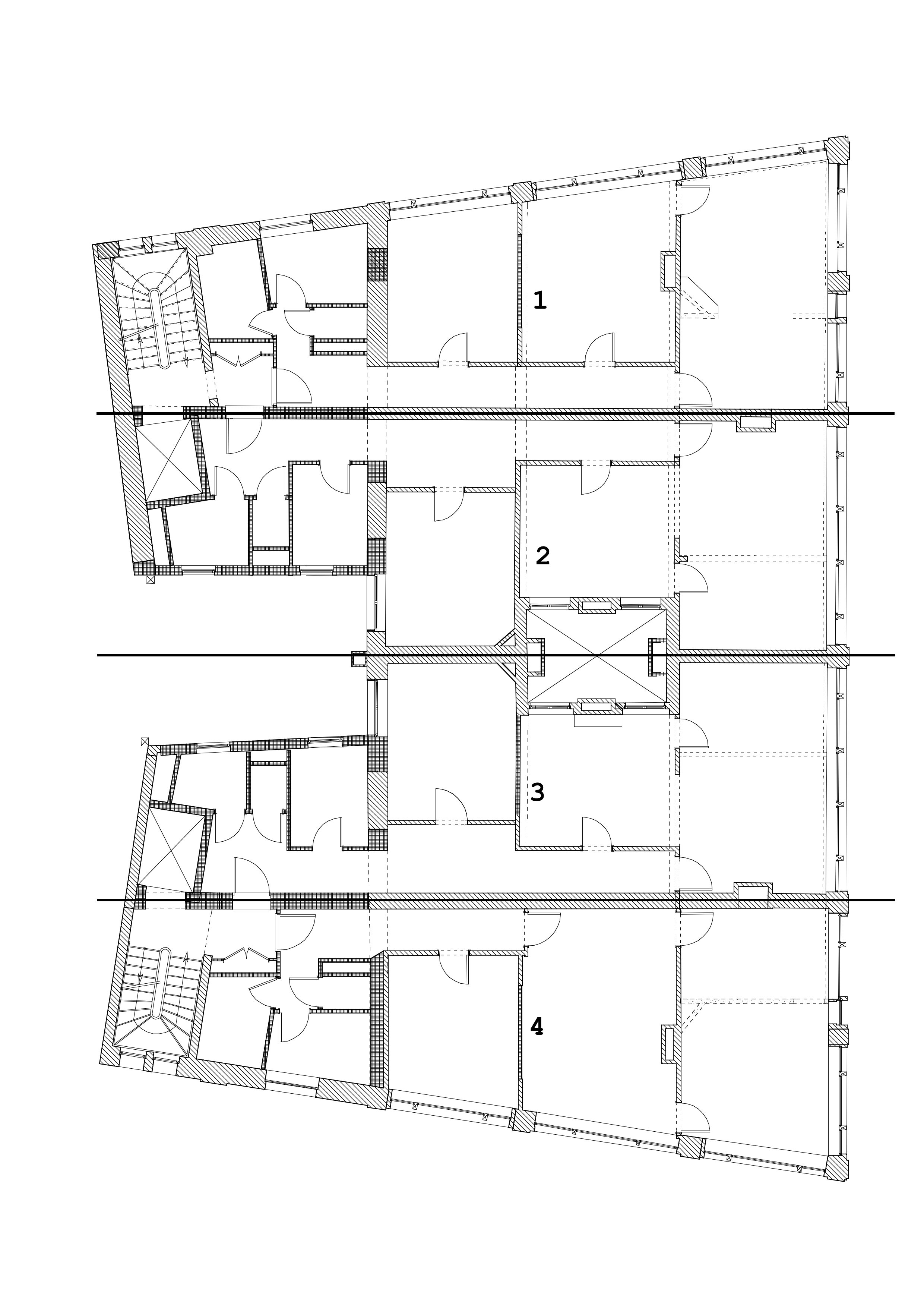 Cette rénovation énergétique est exemplaire et illustre ce qu'il est possible de faire dans un ensemble partiellement classé. Le bâtiment est dans un état structurellement fidèle à l’original avec un plan d’étage très simple et très souple. Les décors et les plafonds anciens sont conservés. Le projet conserve la structure du bâtiment de manière à garder la lisibilité du plan. Les affectations sont adaptées aux nuisances nouvelles : les chambres sont déplacées à l’arrière.