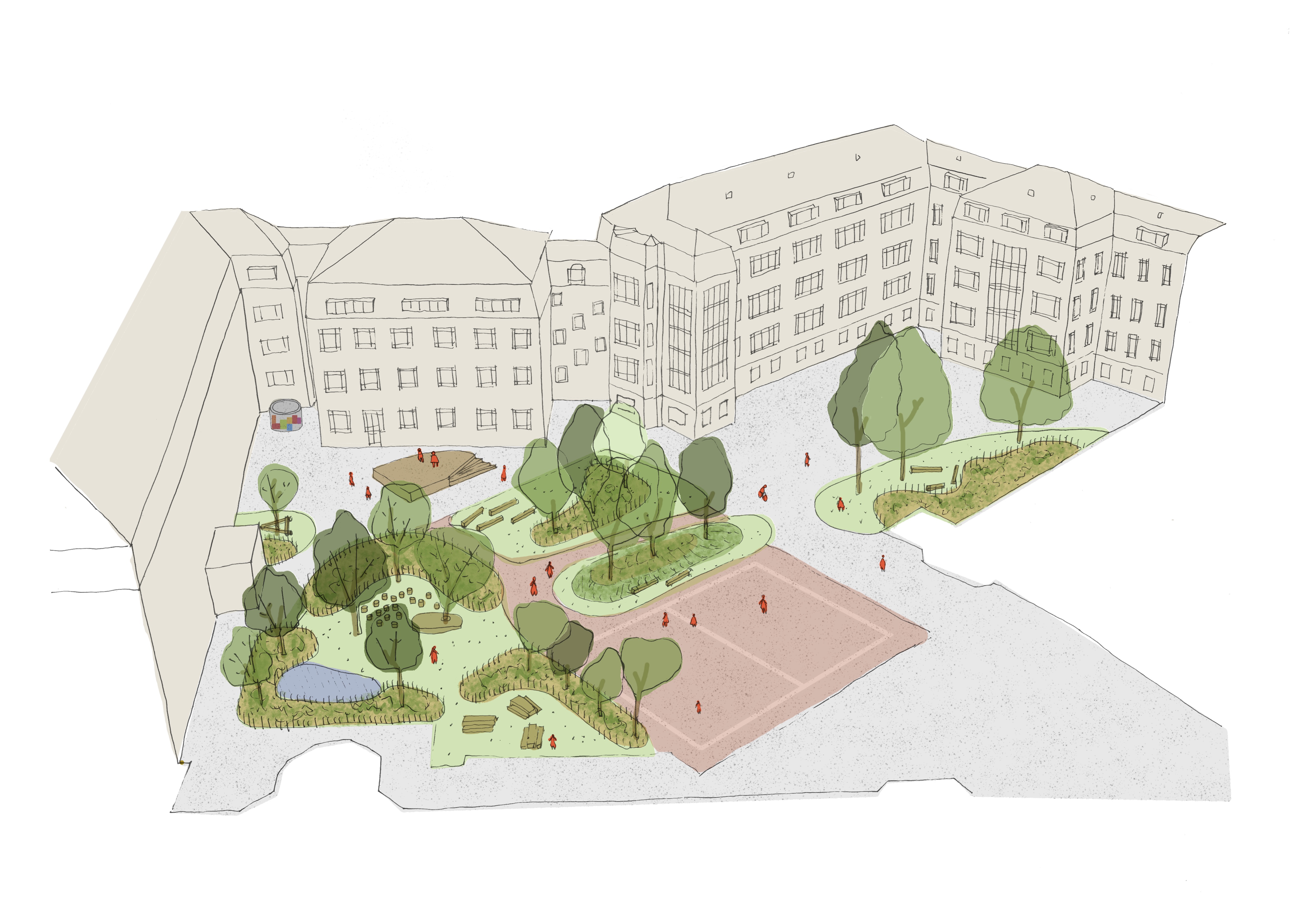 Le projet « Opération Ré-création » est un projet de transformation initié en réponse à l'appel à projets lancé par Bruxelles Environnement, visant à réaménager les cours de récréation de 20 écoles maternelles, élémentaires et secondaires. Ce projet s’articule autour de cinq axes principaux; le réaménagement spatial, l’intégration de la biodiversité à visée pédagogique, l’ouverture sur le quartier, la conception inclusive et accessible, et l’adoption de pratiques durables. S’inscrivant dans le cadre de Bubble.brussels, cette initiative entend promouvoir le bien-être physique, mental et social des enfants, la prévention des addictions, la réduction des risques, et sensibiliser aux stéréotypes de genre.