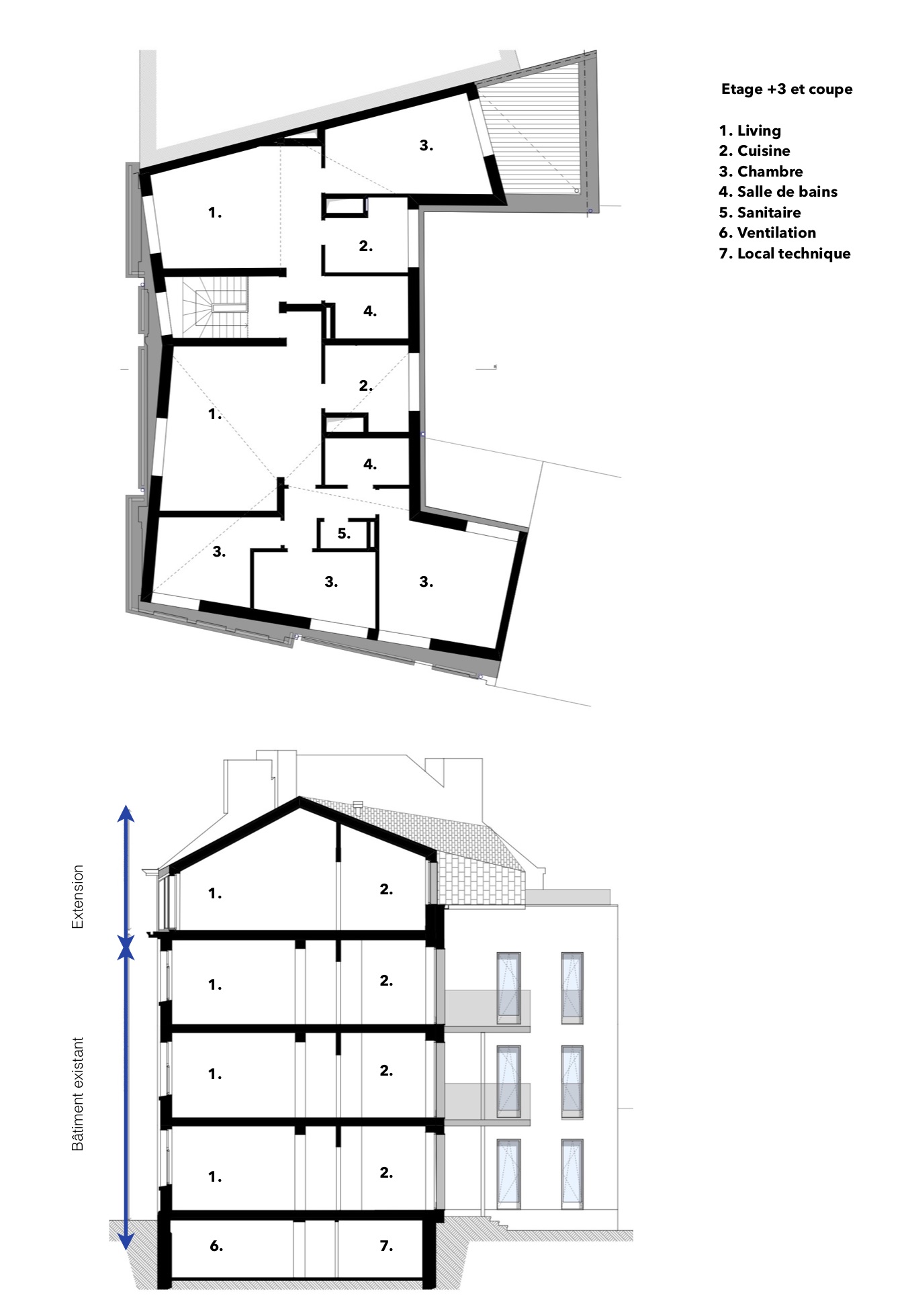 Le projet comprend la rénovation lourde avec restructuration des appartements et des extensions et un nouvel étage contemporain en toiture afin d’offrir des appartements de qualité.
