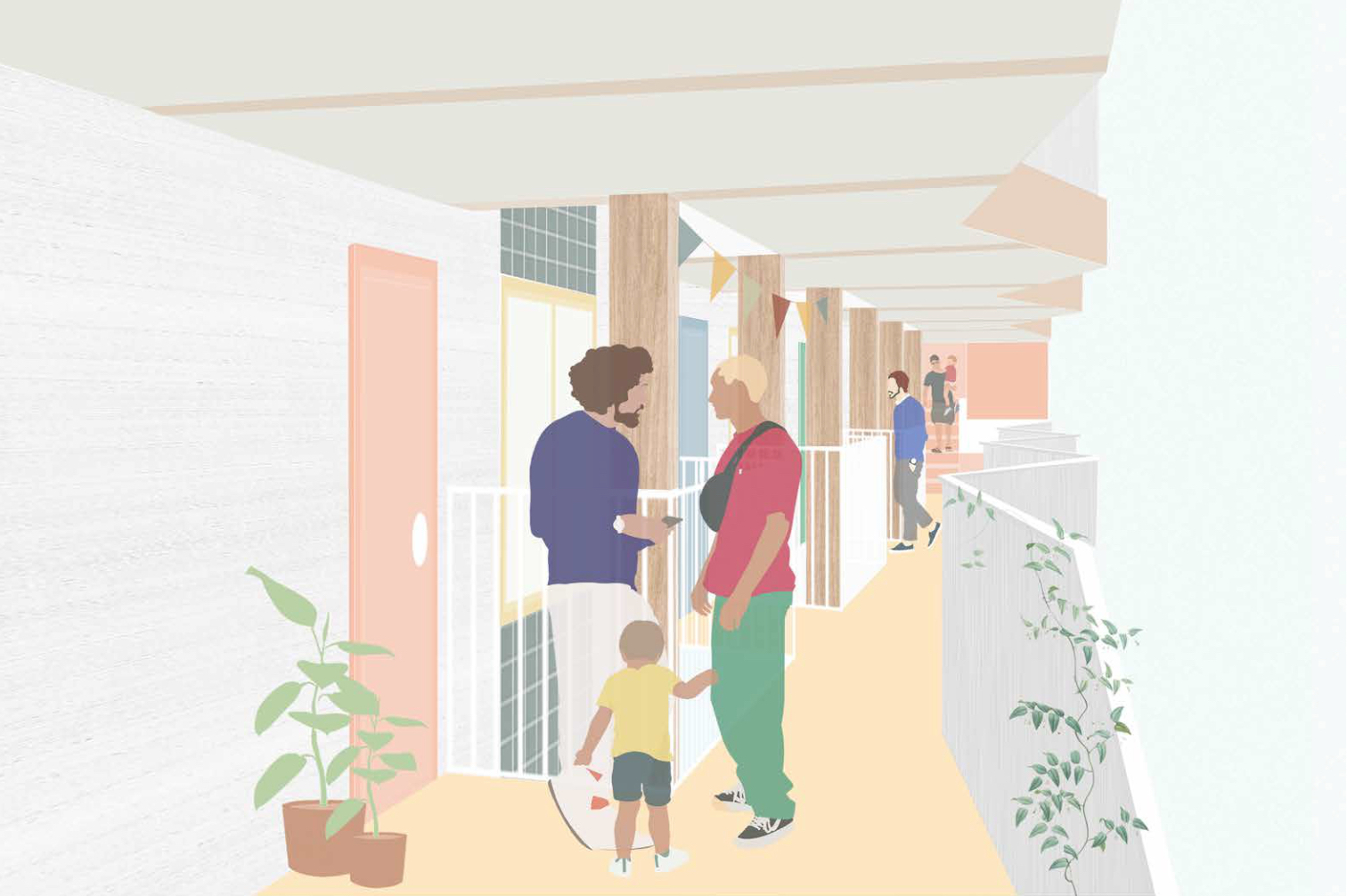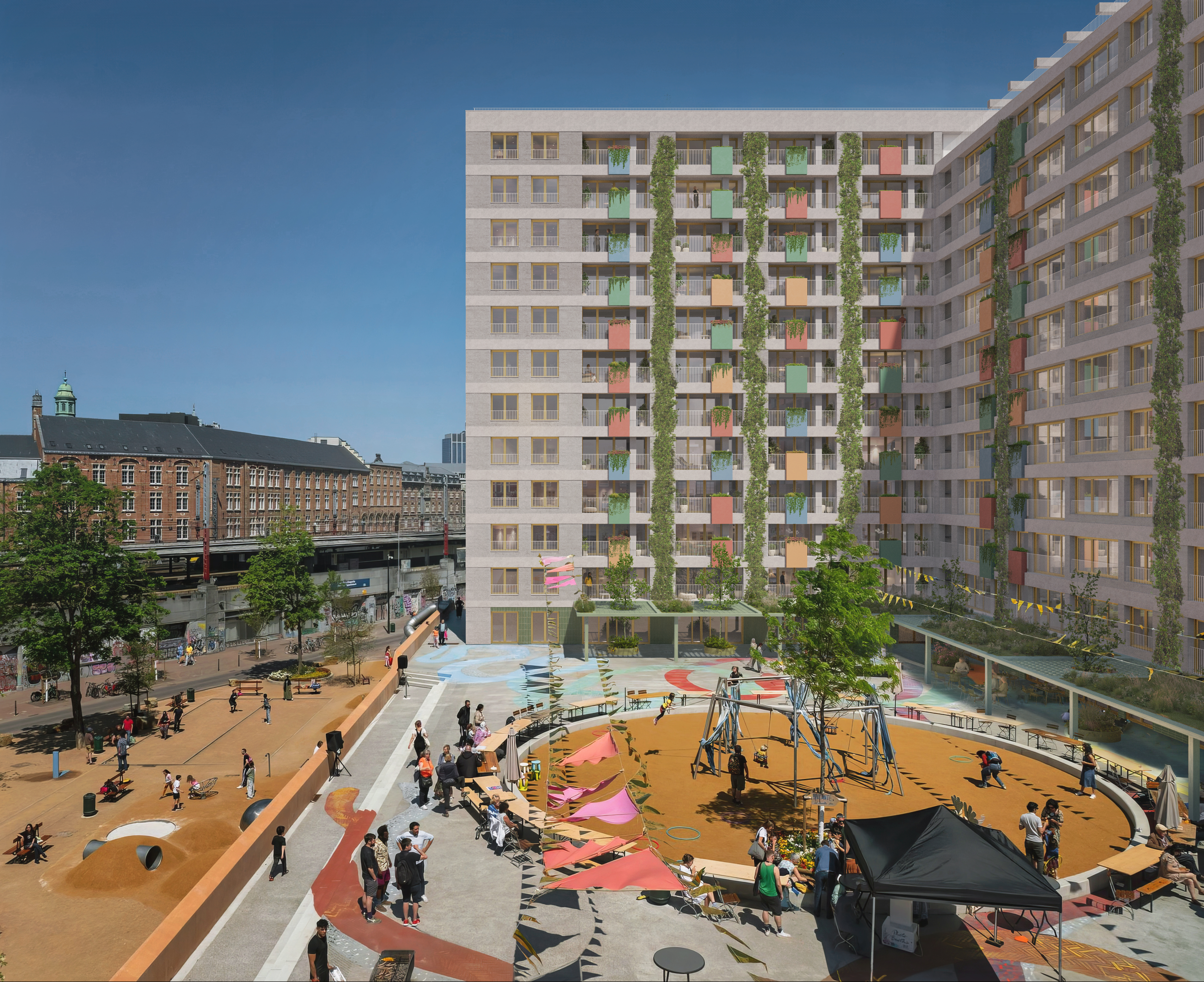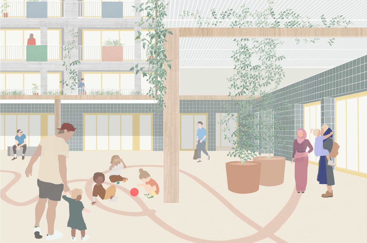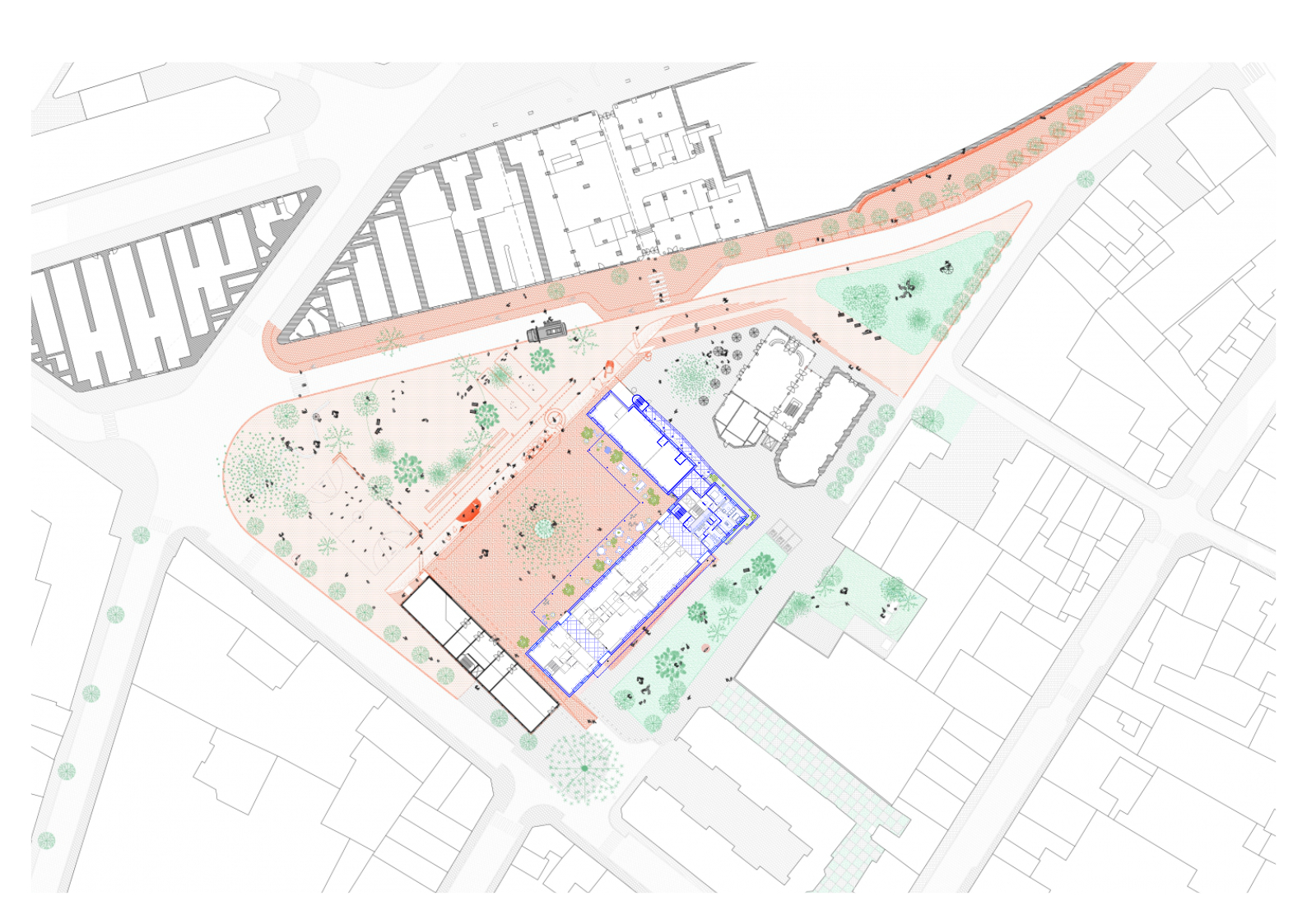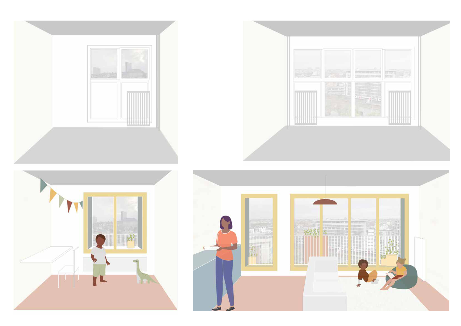 Birgittines, ce bâtiment des années 1970, obsolète mais bien conçu, fait figure de phare dans son environnement. Notre proposition relie le « parvis » des Birgittines au « balcon » grâce à de nouveaux espaces d'accès au rez-de-chaussée. Dans le même ordre d'idées, nous proposons de créer une nouvelle entrée sur la façade nord, offrant une connexion supplémentaire au « parvis » du côté de la chapelle des Birgittines. Avec ce projet de rénovation, nous visons une solution totale : un extérieur de haute qualité qui répond au manque d'isolation et de confort thermique et acoustique. L'installation technique incluse dans la nouvelle peau étanche à l'air pour desservir directement les pièces depuis la façade.