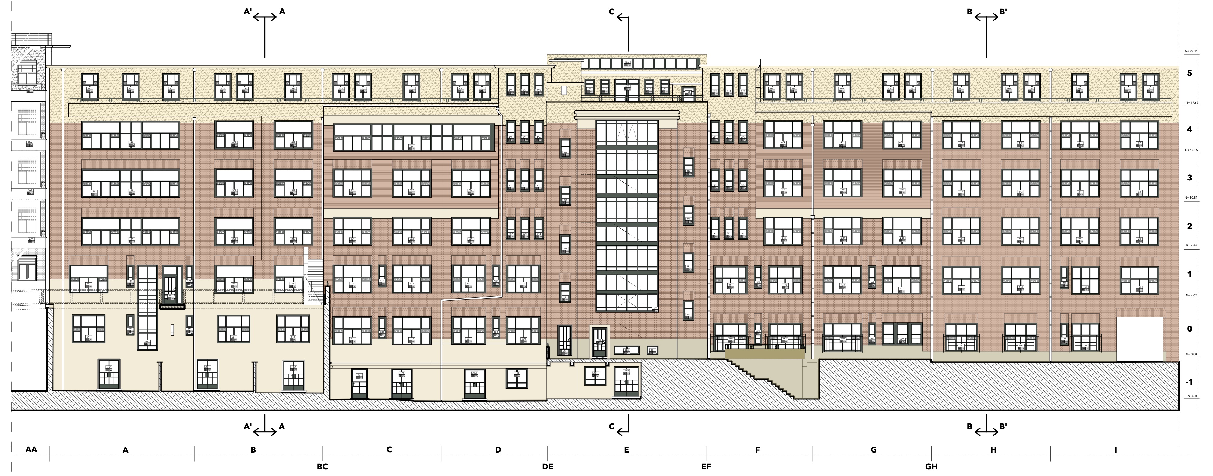 Le projet inclu également la récalification de la cour arrière, en favorisant l’usage de la mobilité douce, en créant des espaces couverts pour le parcage vélos du personnel et des visiteurs. La restauration de toutes les façades ainsi que la reconstitution de la grande verrière de la cage d'escalier. Enfin, le auvent en béton et les devantures des commerces rue Haute sont également restaurés. La proposition de restauration des devantures combine à la fois le souhait de rétablir une situation historique cohérente et de conserver une configuration en adéquation avec le fonctionnement actuel.