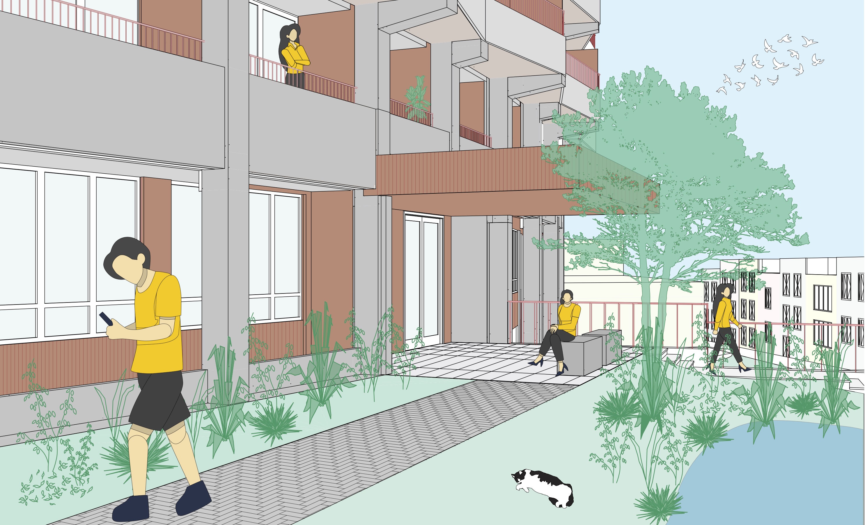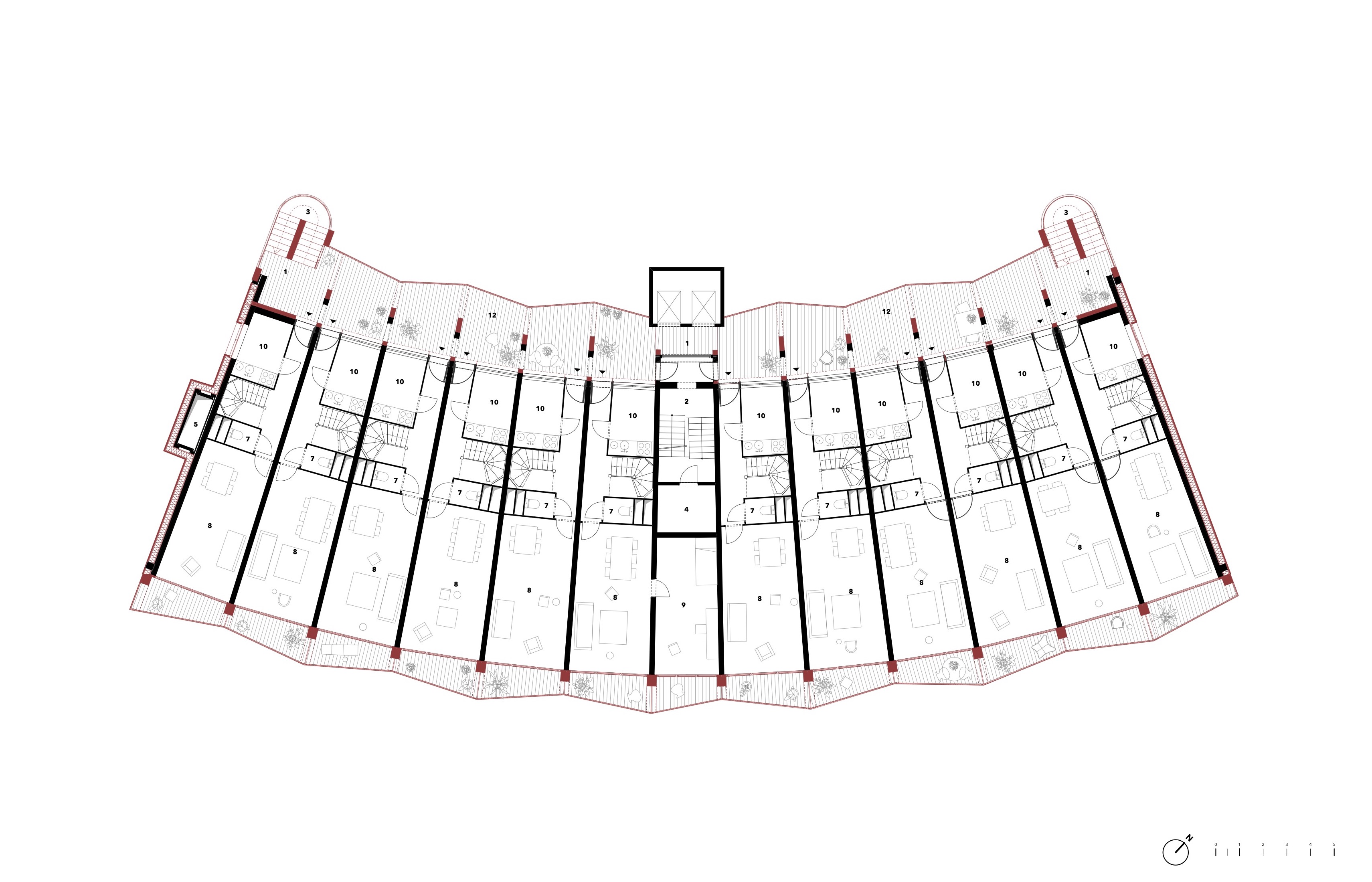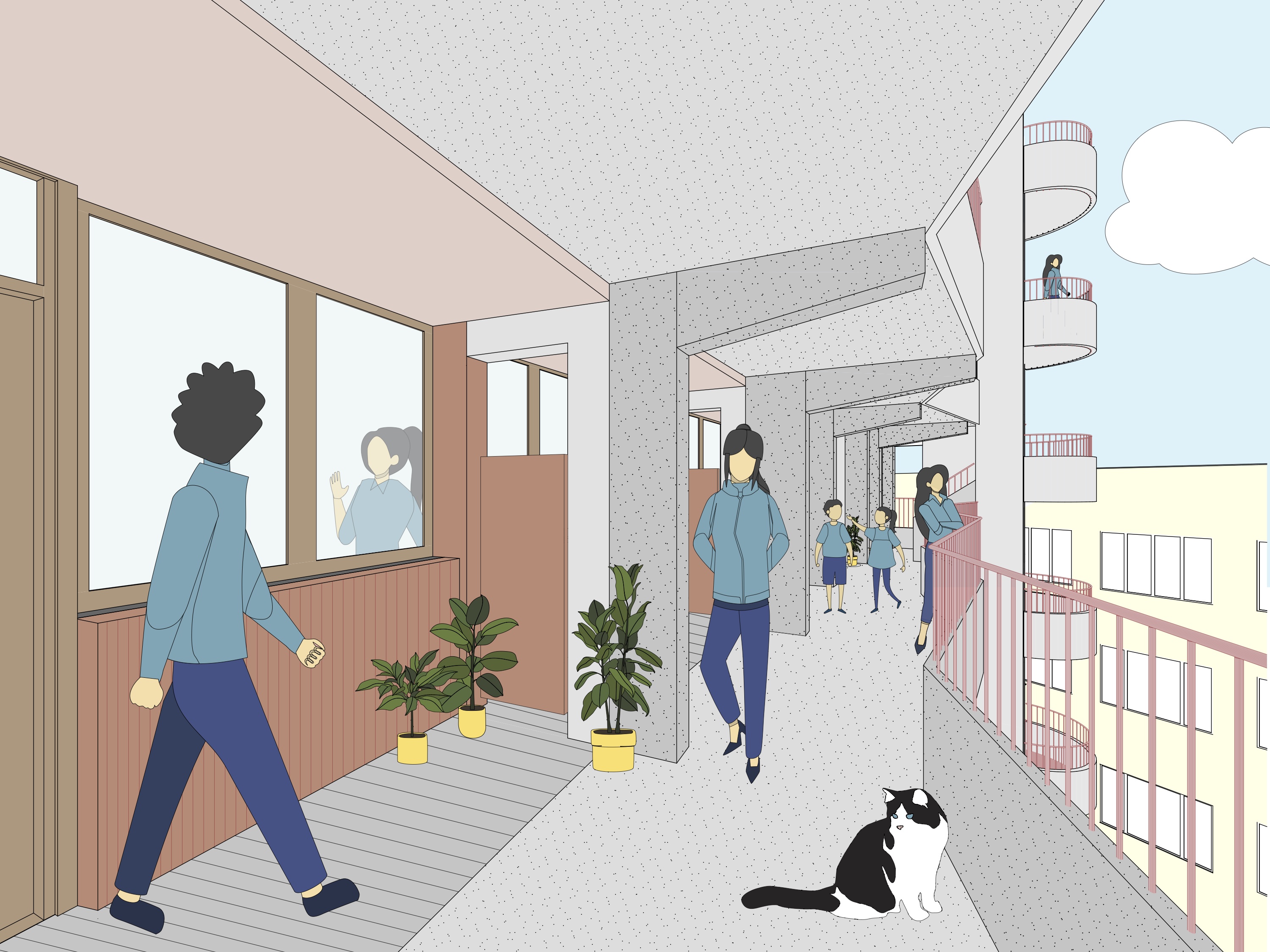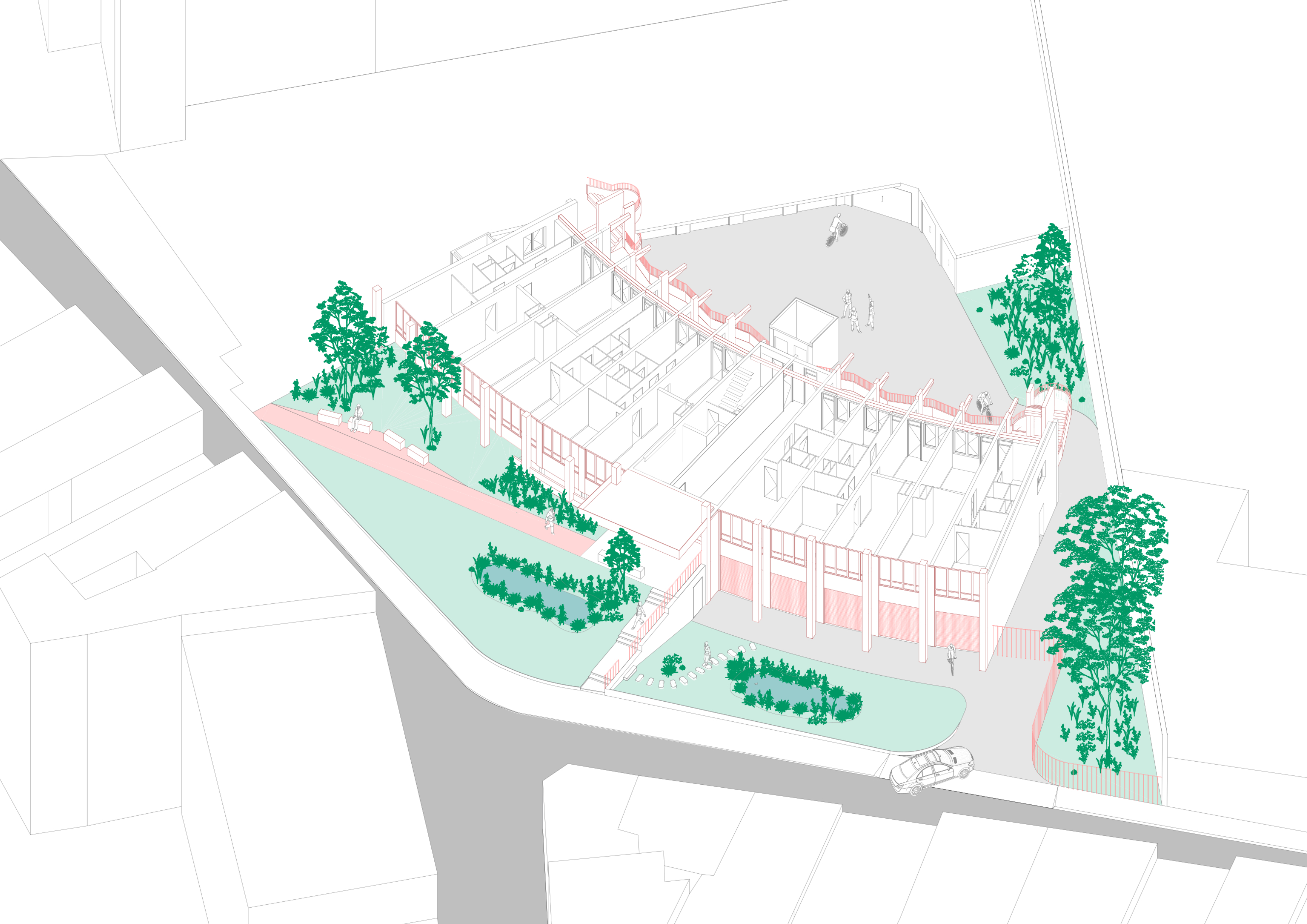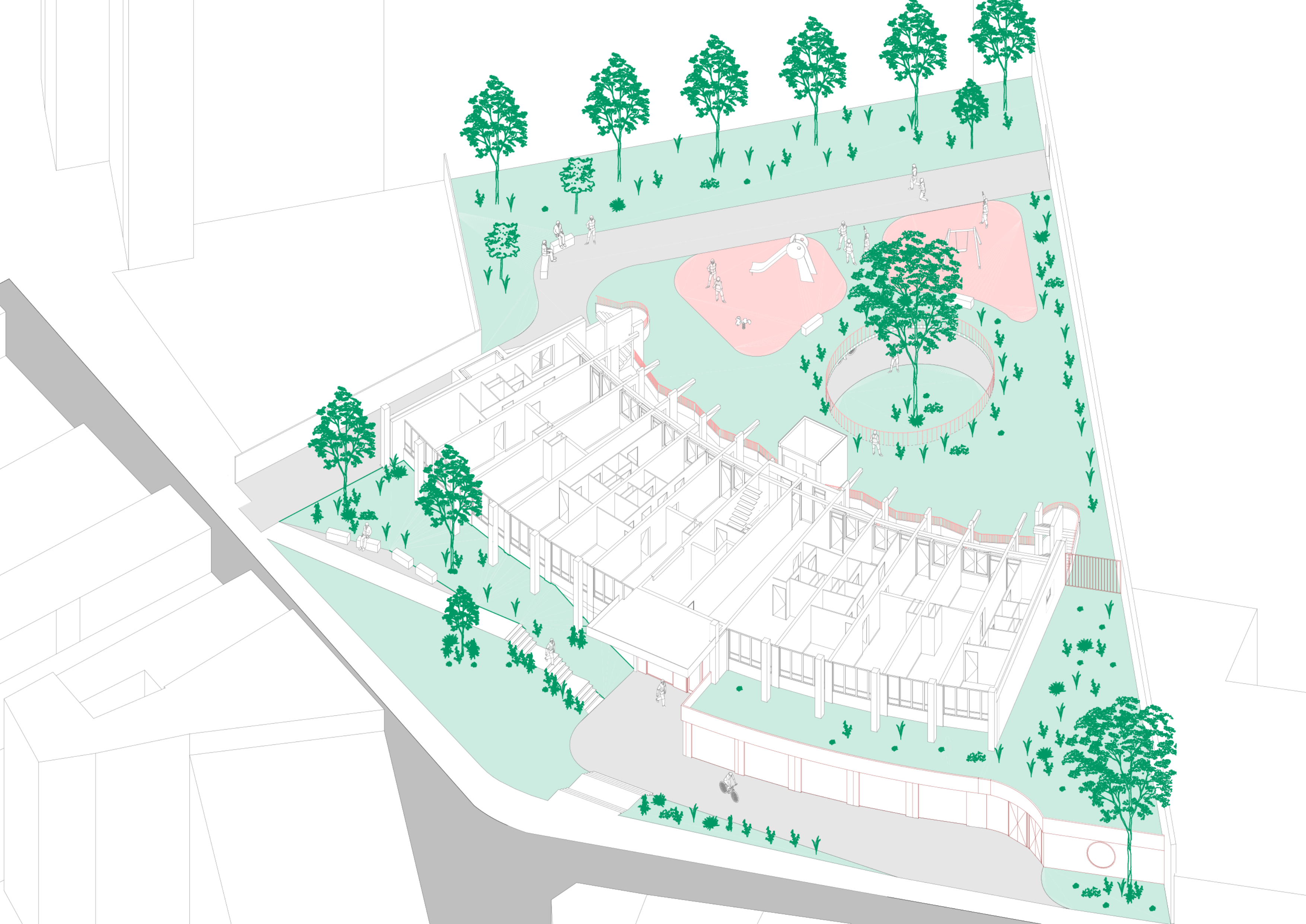 Par sa situation et sa taille atypique dans le quartier, ce logement social apparaît comme un signal dans son environnement et a une forte présence. Son intérêt architectural et ses caractéristiques, ont guidé notre proposition. La réalisation d’une nouvelle enveloppe permet de résoudre plusieurs faiblesse du plan actuel, tel que le manque de lisibilité des accès et les problèmes des sécurités.