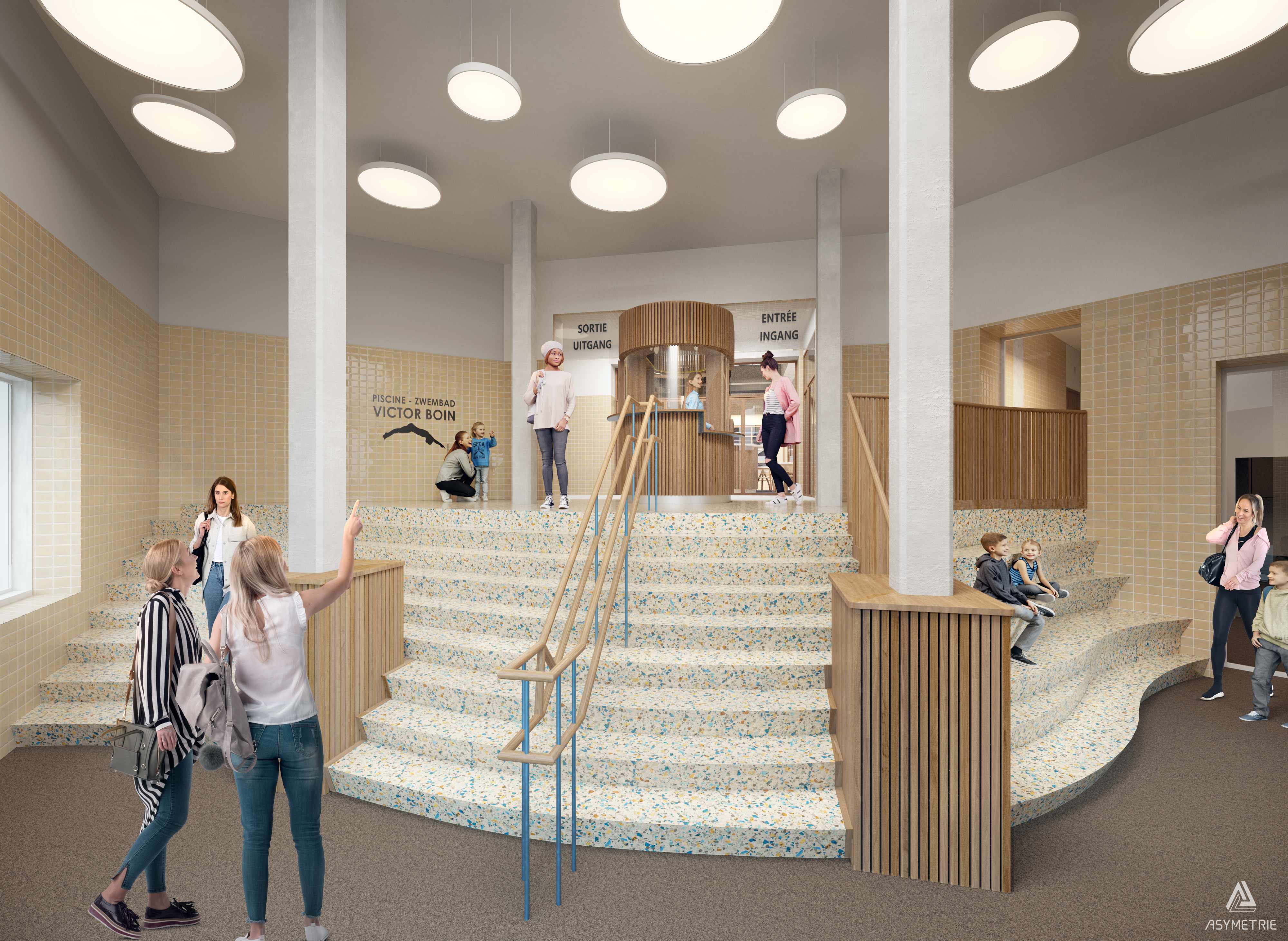 La piscine communale Victor Boin est construite en 1905 selon des plans des architectes Cooreman et Rau. Son profond remaniement dans un style Art Deco entre 1938 et 1940 par l'architecte-inspecteur communal Ingelbrechten en fait l’un des derniers témoins bruxellois du patrimoine architectural des bains et piscines de l’entre-deux-guerres. D'une part, le projet s'attache à mettre en valeur les caractéristiques historiques et à respecter l’atmosphère du lieu. D'autre part, le bâtiment doit être adapté aux normes et exigences actuelles. Les priorités sont donc de faciliter l’utilisation pour le public et le personnel, d'améliorer la sécurité et l’accès aux personnes à mobilité réduite mais également le confort et le bien-être, dans des espaces favorisant les relations sociales.